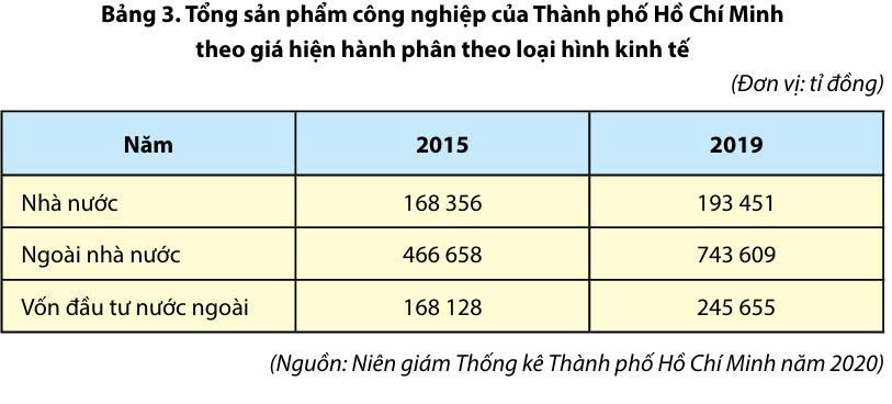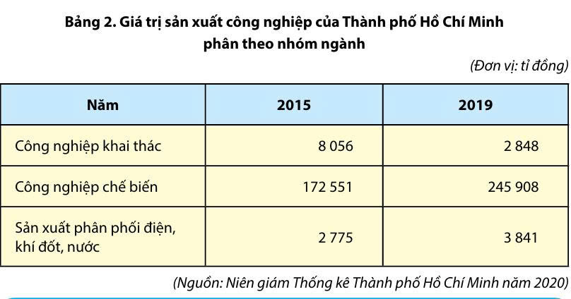 Cơ cấu công nghiệp theo ngành ở Thành phố Hồ Chí Minh đang có sự chuyển dịch theo hướng giảm tỉ trọng trong ngành công nghiệp khai thác, tăng tỉ trọng trong ngành công nghiệp chế biến và sản xuất phân phối điện, khí đốt, nước.