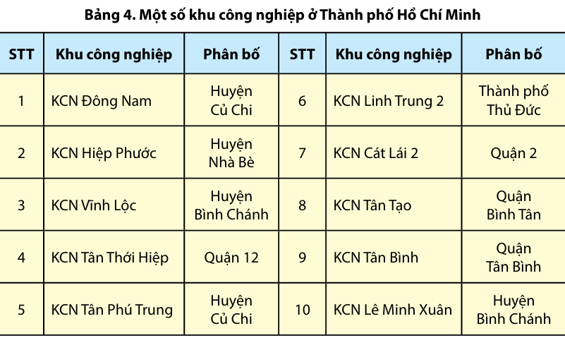 Cơ cấu ngành công nghiệp ở Thành phố Hồ Chí Minh tương đối đa dạng, bao gồm các nhóm ngành: khai khoáng; công nghiệp chế biến, chế tạo; sản xuất và phân phối điện, khí đốt, nước nóng, hơi nước và điều hoà không khí; cung cấp nước, hoạt động quản lí và xử lí nước thải, rác thải.